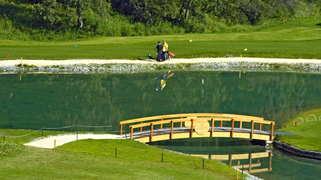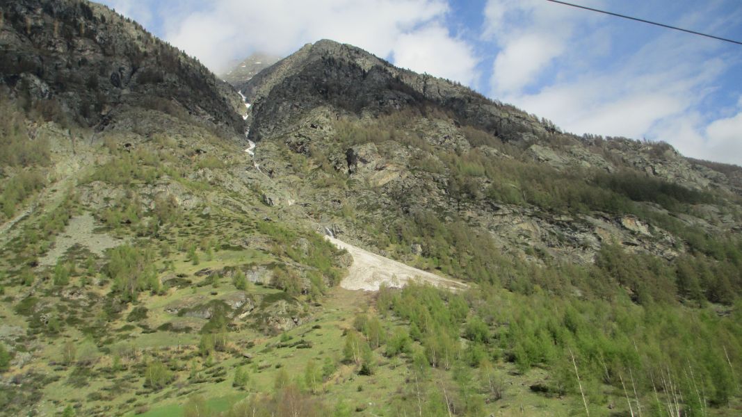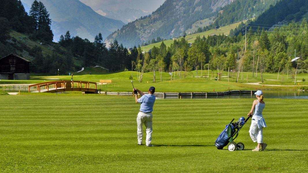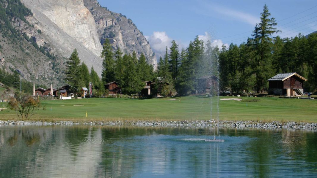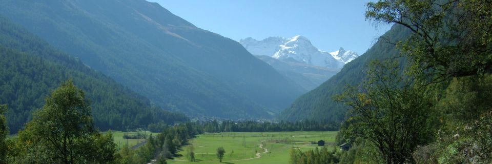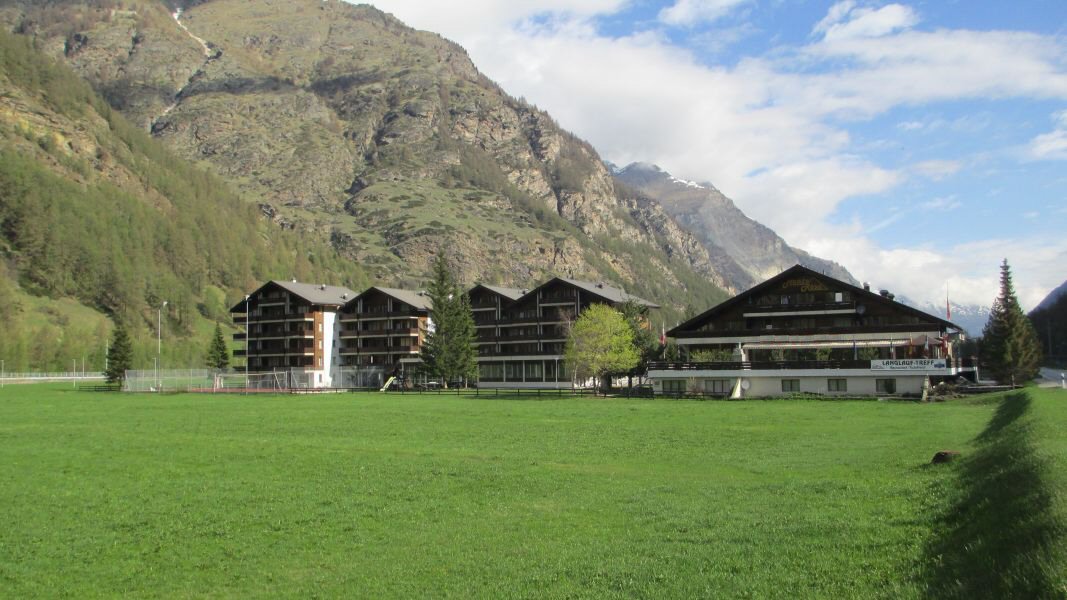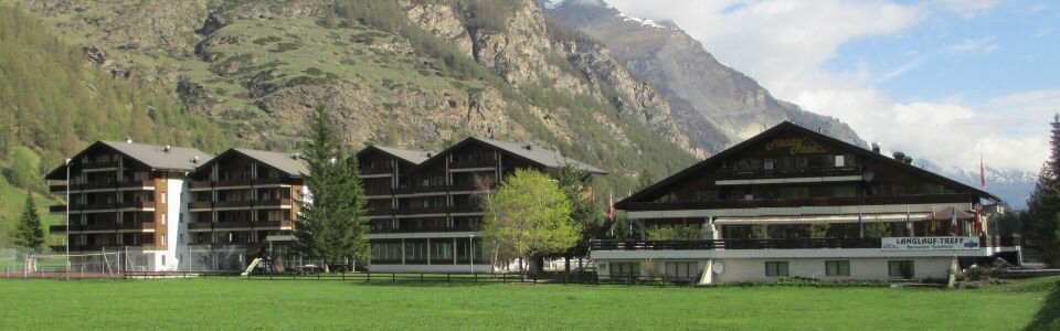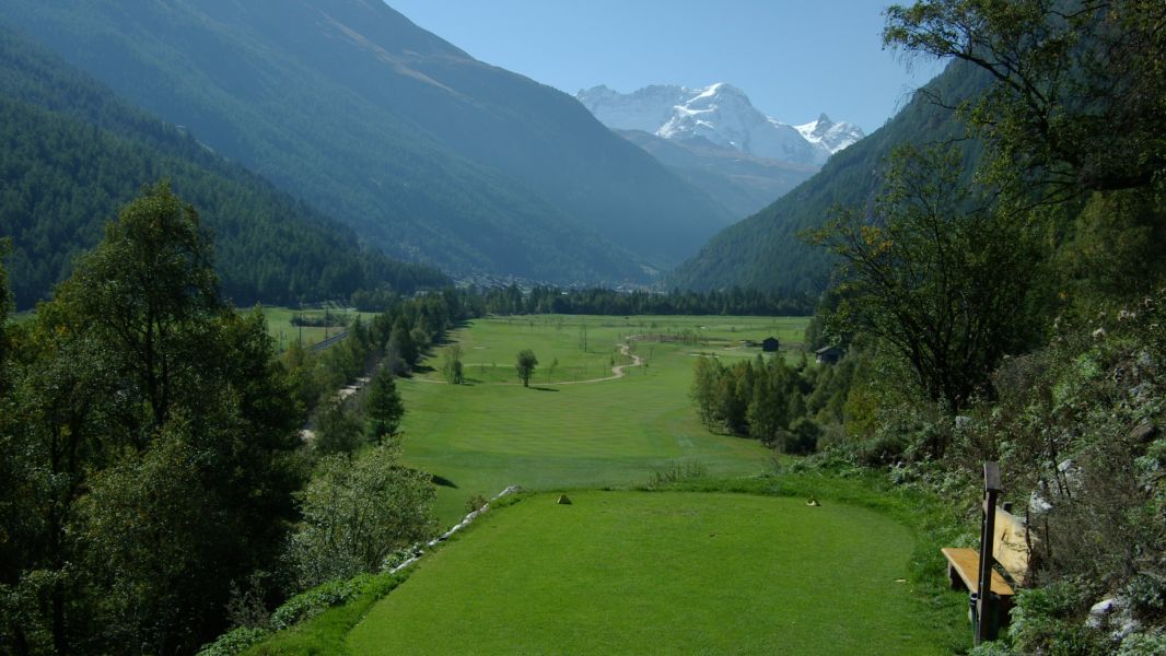 GC MATTERHORN in RANDA. Der rechte schneebedeckte Berg ist das 'Kleine Matterhorn' Hinter der querverlaufenden Baumreihe im Hintergrund befindet sich die Ferienanlage MONTE ROSA.