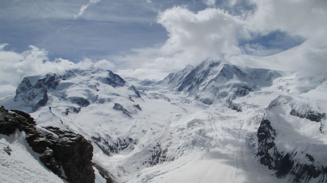 ZERMATT: Blick vom GORNERGRAD-Restaurant in die ZERMATTER Bergwelt (im Monat Mai).